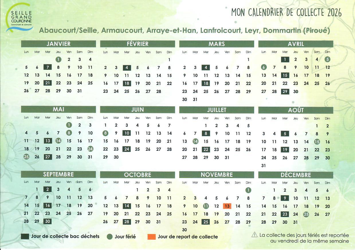 Pour chaque semaine qui comporte un jour férié, le jour de collecte est reporté au vendredi.