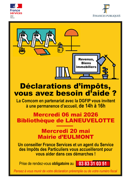Dans le cadre de la campagne de déclaration de revenus 2026 sur les revenus 2025, France Services Seille & Grand Couronné, en partenariat avec le SIP de Nancy, propose deux permanences pour accompagner les habitants dans leurs démarches :